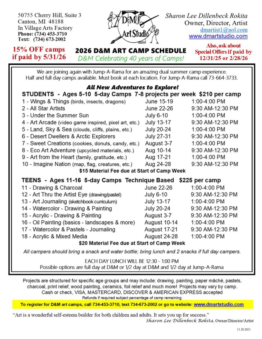 Art Camps are a great opportunity for young people to discover their creative potential while being taught a wide variety of techniques in drawing, painting, pastels, collage, and more plus learn about art around the world. Materials included. Camps are in the morning or afternoon and are week-long. Sign up with Jump-A-Rama and bring lunch to make full day experiences.